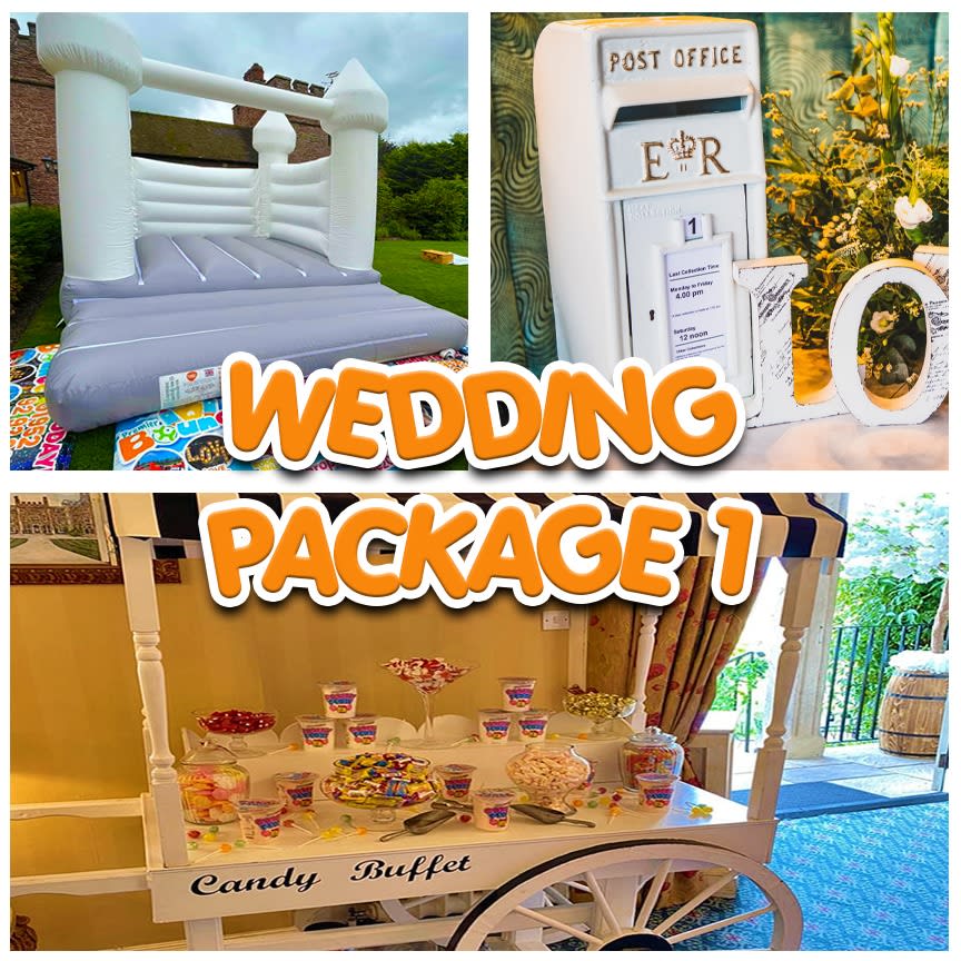 Wedding Sweet Cart & Bouncy Castle Package for Hire available across Shropshire & surrounding areas from Telford to Whitchurch at fantastic prices to cater to everyones budget. Our beautiful Wedding package is a great feature to any Wedding Occasion & entails a variety of Wedding Props from Sweet Carts & Wedding Post Box to a contemporary Adults & Childs Turret design Bouncy Castle ideal for indoor & outdoor Wedding Events. Set the scene with a mixture of products we have available to Hire for Wedding Events across Telford & Bridgnorth. Book your Wedding accessories with us today & tick it off your list.