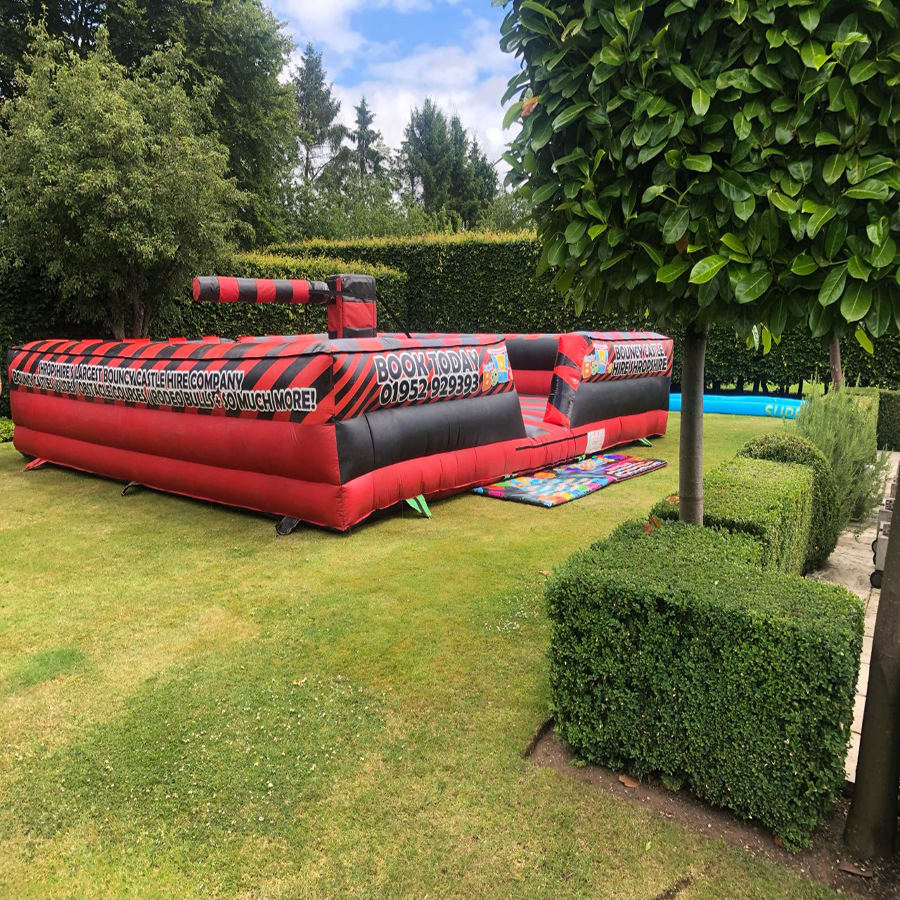 Total Wipe Out Hire across Telford & Shropshire regions. What a great Party pleaser ideal for all occasions from Birthday Parties, Summer Fundays to School Fetes & Events this FunFair attraction will not disappoint! Our Last man standing Inflatable mechanical Wipe Out game is not for the faint hearted, ideal for both children & adults of all ages! Stand on one of six numbered stands and simply jump over the rotating foam padded arm & quickly duck the next before you get knocked off your stand & out of the game! This item comes with a fully trained experienced operator. This Total Wipeout mechanical game hire is perfect for team building exercises for all industries, bringing competitiveness in heaps!