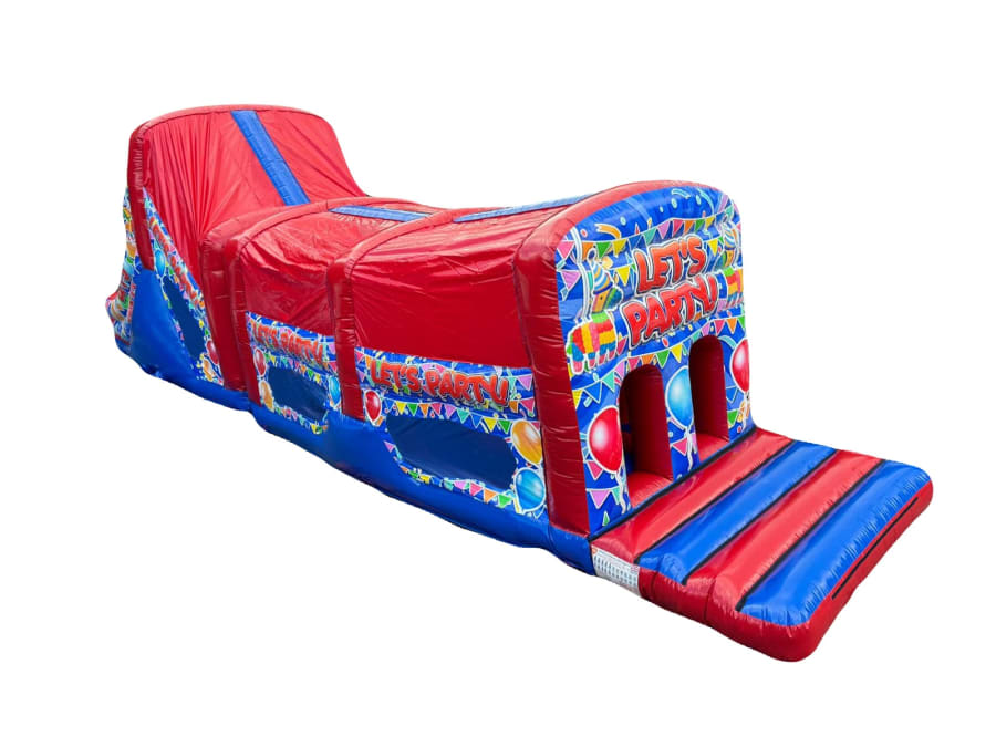 - Inflatable Party themed Obstacle Course perfect for School Fetes, Summer Fun Days, Corporate Occasions.