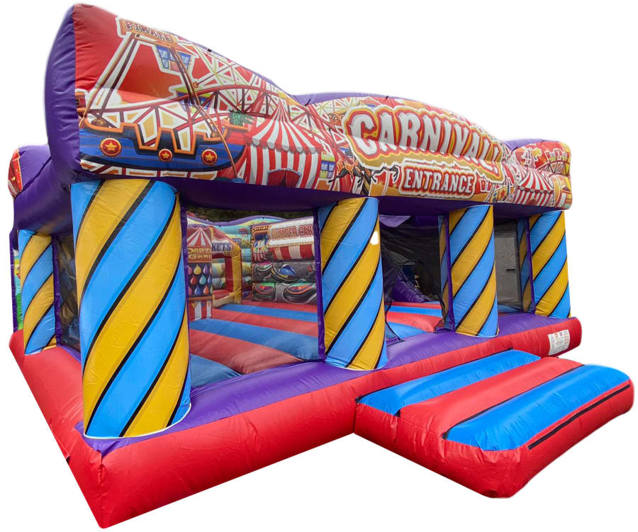 One word...WOW! Look at our amazing Super Sized Inflatable Carnival Bouncy Castle available to Hire across Shropshire & surrounding areas which Includes Telford, Shrewsbury, Whitchurch & Bridgnorth which features loads of activities all in one place! Our Carnival themed BIG BOY BOUNCER is a HUGE Inflatable and is ideal for not only Children but Adults too! Gaze into this Super Sized Jumping Castle from outside to see the Children (or Adults) having so much fun through the fully netted sides. This Inflatable is available to Rent at fantastic prices across Shropshire & is perfect for Large Garden Parties, School Fetes, Summer Fun Days, Bonfires & Corporate Events plus SO MANY MORE! This product features Biff & Bash tumble posts to run into & knock over creating Obstacles, Picture Bouncy Climb Frame, Bounce area, & Up & Over Internal Slide! A really Fun Activity Bouncy Castle for all ages with unisex colours scheme & digitally printed artwork to suit.