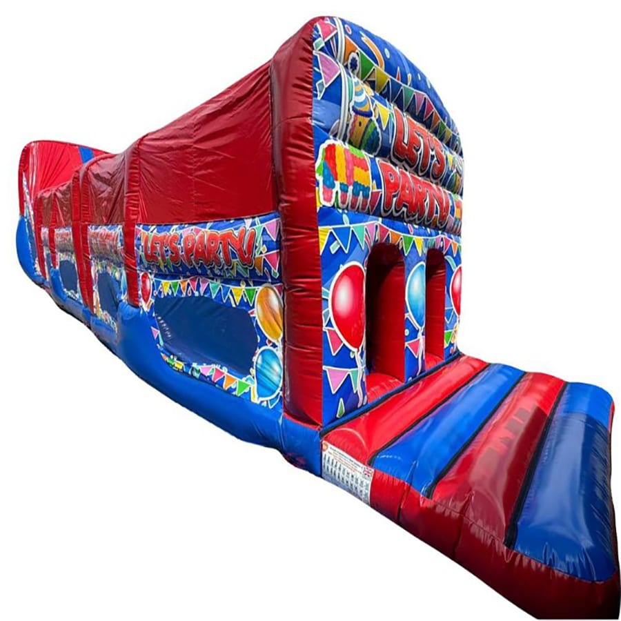 70ft Party Time Bouncy Obstacle Course available to Hire from Premier Bounce! This superb Unisex Inflatable Obstacle Course is so vibrant with its Blue & Red colour scheme & bold Party themed artwork it is unbelievable. Have lots of fun with this Three Part (3 Part) Inflatable that connects together to make one massive Bouncy Obstacle Course perfect for Children & Adults! This Super Bouncy Obstacle Course Fun Run is not for the faint hearted it includes a variety of Obstacles such as Climb through Walls, Biff & Bash pillars, Bounce Area, Multiple Clamber Ramps & finish off with a 7ft Platform Bouncy Slide all enclosed with observation widows positioned down each side. Our Party Obstacle Course has a built in Sun / Shower cover & fully enclosed, in one way & out the other then run back round for another go!