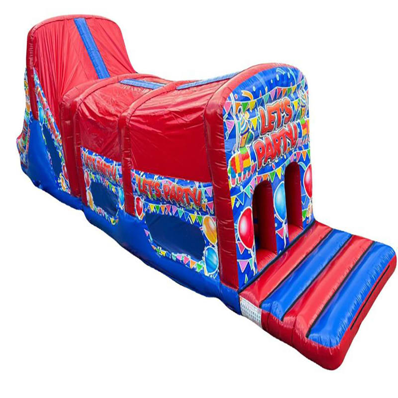 - Inflatable Party themed Obstacle Course perfect for School Fetes, Summer Fun Days, Corporate Occasions.