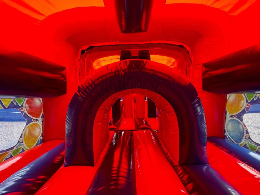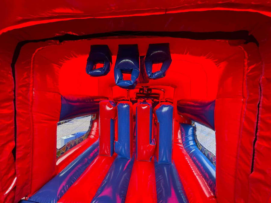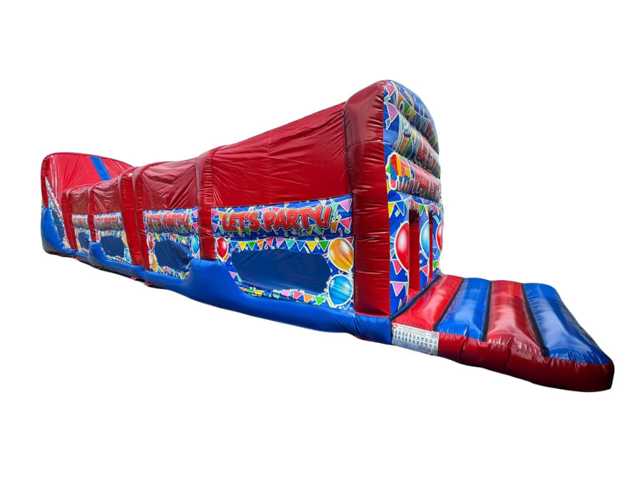70ft Party Time Bouncy Obstacle Course available to Hire from Premier Bounce! This superb Unisex Inflatable Obstacle Course is so vibrant with its Blue & Red colour scheme & bold Party themed artwork it is unbelievable. Have lots of fun with this Three Part (3 Part) Inflatable that connects together to make one massive Bouncy Obstacle Course perfect for Children & Adults! This Super Bouncy Obstacle Course Fun Run is not for the faint hearted it includes a variety of Obstacles such as Climb through Walls, Biff & Bash pillars, Bounce Area, Multiple Clamber Ramps & finish off with a 7ft Platform Bouncy Slide all enclosed with observation widows positioned down each side. Our Party Obstacle Course has a built in Sun / Shower cover & fully enclosed, in one way & out the other then run back round for another go!