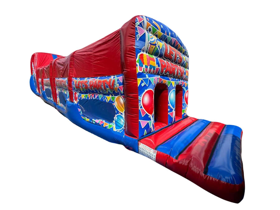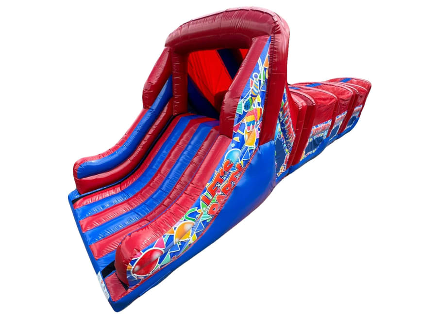 - Inflatable Party themed Obstacle Course perfect for School Fetes, Summer Fun Days, Corporate Occasions.