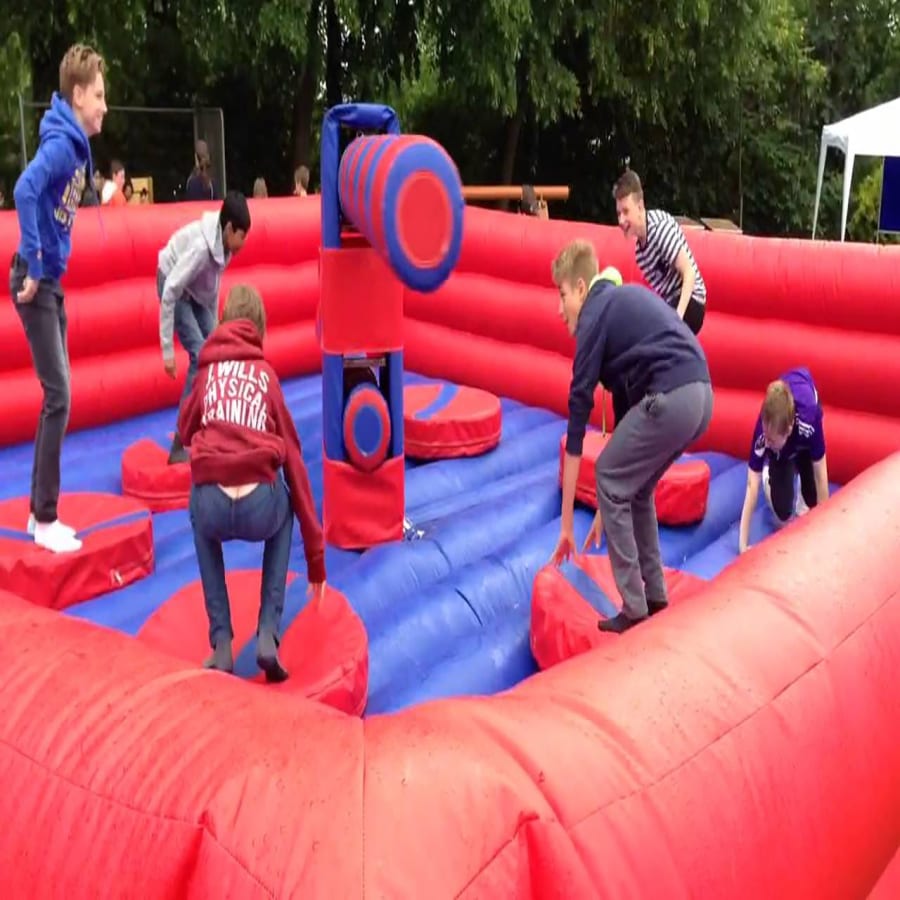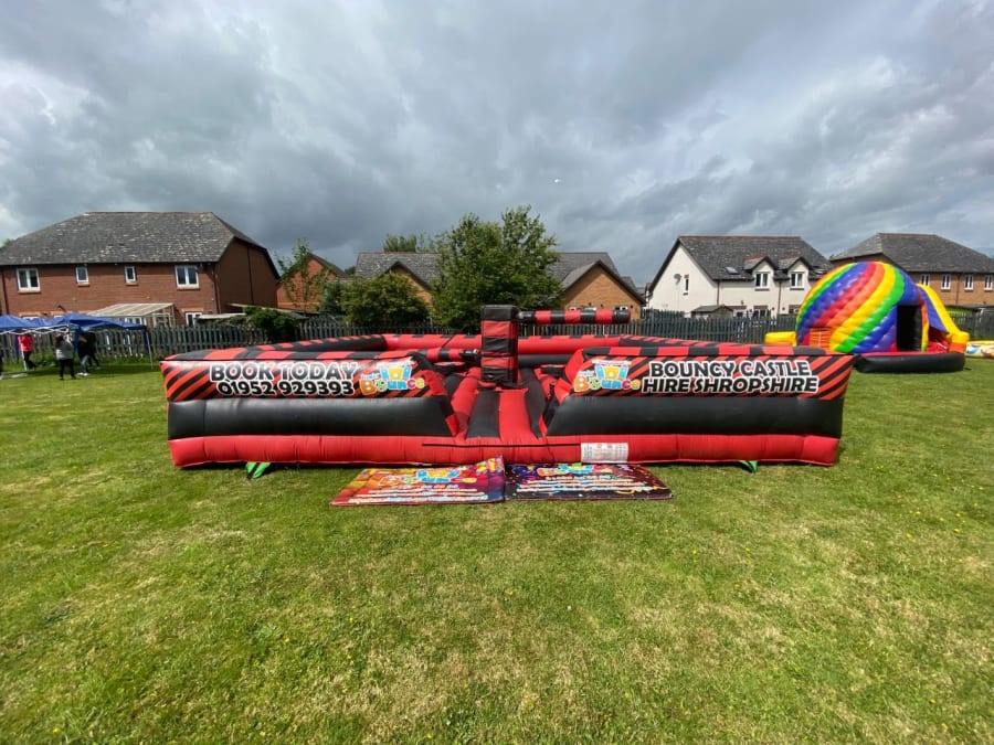 Total Wipe Out Hire across Telford & Shropshire regions. What a great Party pleaser ideal for all occasions from Birthday Parties, Summer Fundays to School Fetes & Events this FunFair attraction will not disappoint! Our Last man standing Inflatable mechanical Wipe Out game is not for the faint hearted, ideal for both children & adults of all ages! Stand on one of six numbered stands and simply jump over the rotating foam padded arm & quickly duck the next before you get knocked off your stand & out of the game! This item comes with a fully trained experienced operator. This Total Wipeout mechanical game hire is perfect for team building exercises for all industries, bringing competitiveness in heaps!