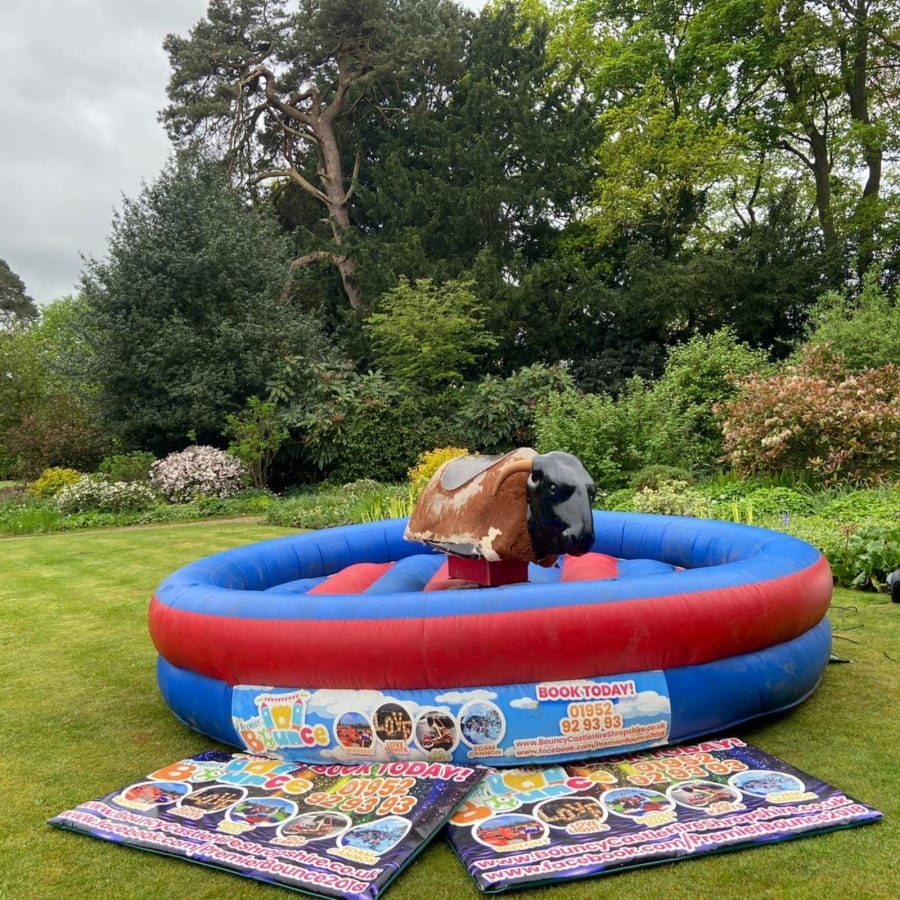 Mechanical Rodeo Bull for hire in Telford Shropshire is ideal all age groups. A fantastic product alongside any bouncy castle and ties in well with any of our wedding Bouncy castles and accessories. Suitable for indoor as well as outdoors