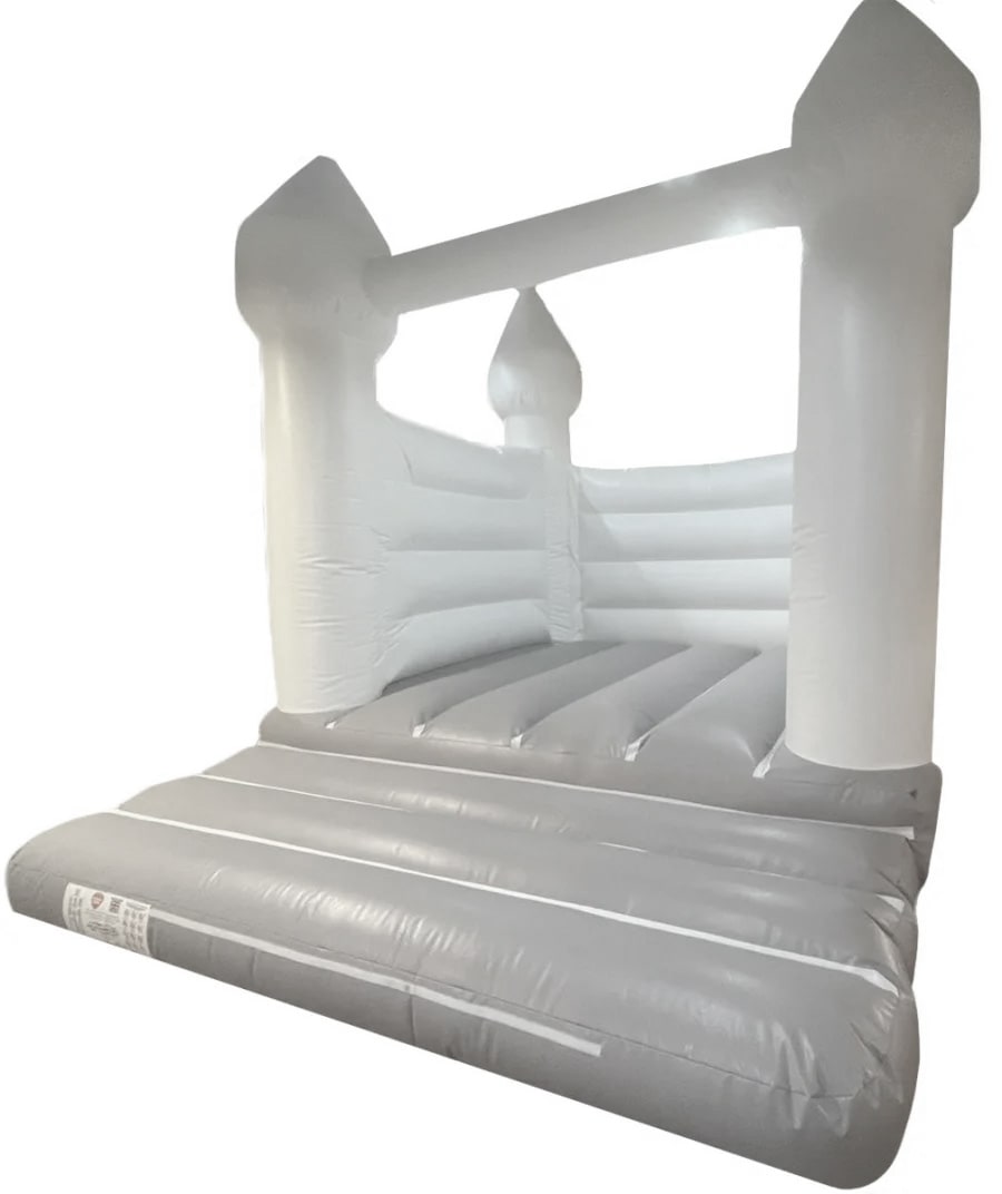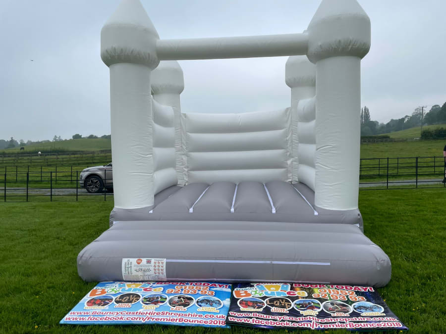 White & Grey Pastel Wedding Bouncy Castle for Hire by Telfords largest supplier & Party Event Hire Equipment Supplier. This beautiful Adults & Children's Wedding Bouncy Castle is second to none & really looks the piece at any Wedding or Party event. This item has a soft Grey Bouncy bed with pure White pillars, walls & Turret frontage. Our Wedding Turret Bouncy Castle is perfect for Indoor or Outdoor Hires which most definitely stands out amongst any crowd. Look the part at your wedding & have some fun memories on our Pristine Wedding Inflatable available to Rent for all budgets. We Supply our Wedding Bouncy Castles at various locations across Shropshire Venues from the Wroxeter Hotel, Hadley Park House to Rowton Castle. Book for your special day with us today!